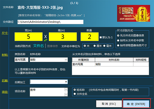 为广告公司的业务员提供了快速开单的功能,拖动图片到软件,软件可以自动识别图片中的信息,包含项目名称(制作内容)、材料名称、宽、高、制作数量以及后期 加工等信息,材料单价此前已经绑定,自动显示,所以整张单据都不需要再手动去填写相关的业务信息,广告公司管理软件就已经自动开好单据。保存,用“一键传图”将图片传至服务器,登账。