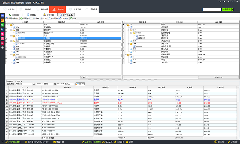 飞扬动力广告公司管理软件企业版提供了标准财务管理模块。业务中各单据都会自动生成会计凭证对应到相关的会计科目当中,财务人员可以查询资产负债表和损益表,直接查看公司整体的经营状况。
