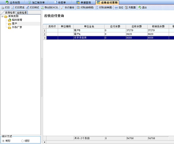 在收款单登帐之前,本月“太平洋百货”客户做过的三张加工制作单都还没有结算,那么在结算查询中,这三张单的状态都是“未结清”,如下图所示。